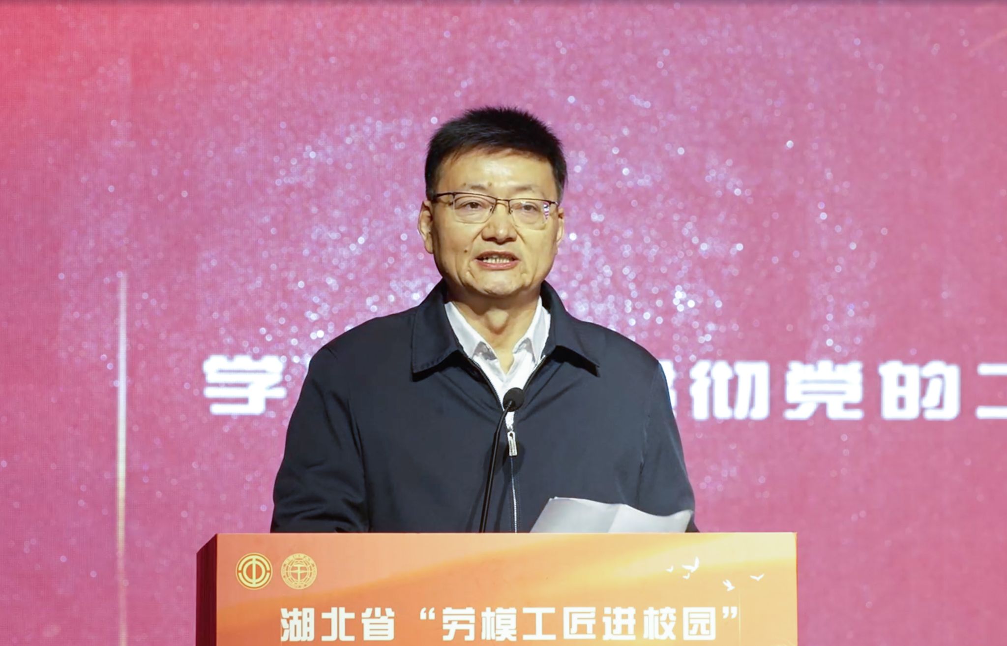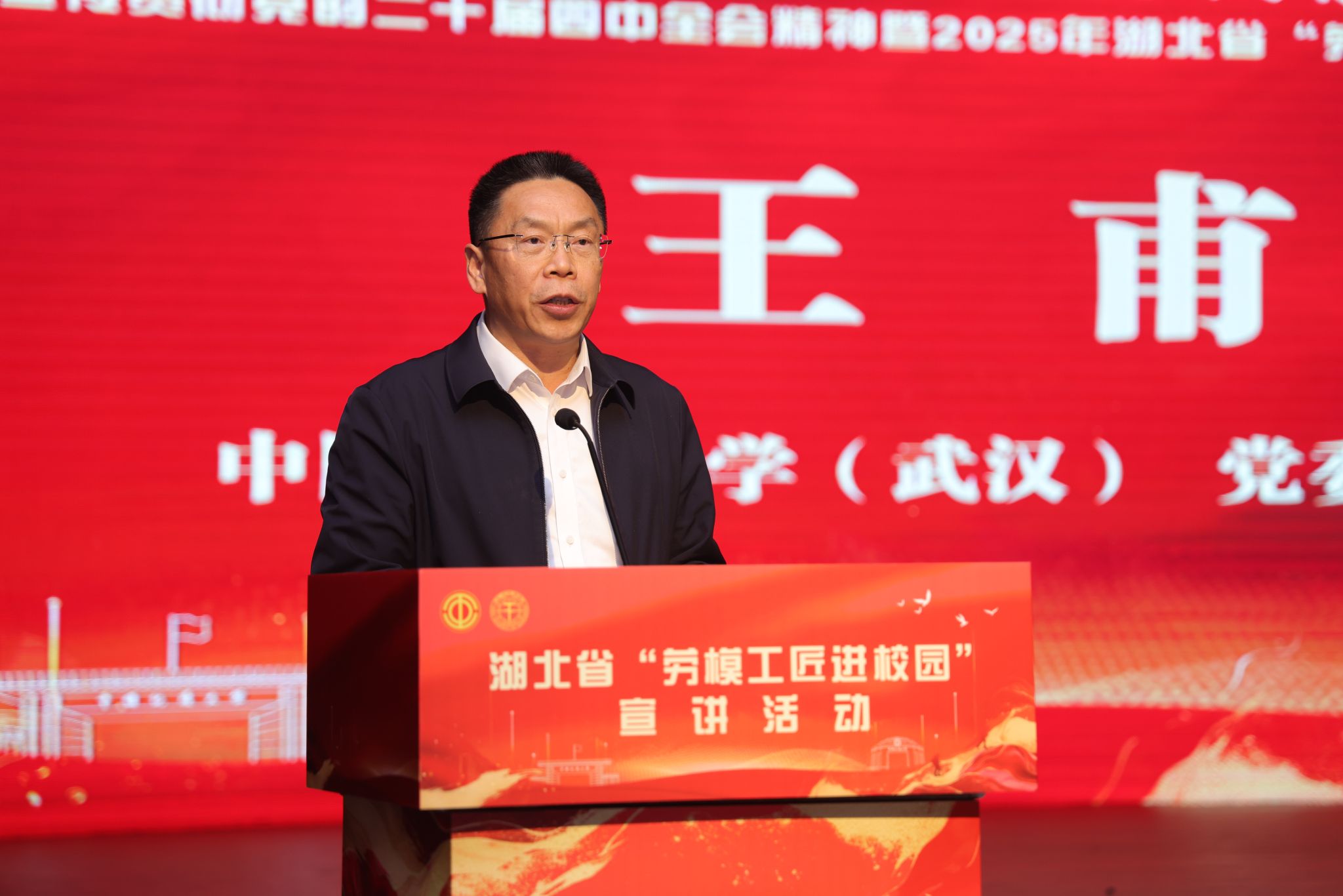 地大新闻网讯(通讯员 李梦琳 摄影 焦思勤 高雅 李迅)11月27日,由湖北省总工会主办,湖北省教科文卫体工会承办,我校协办的“弘扬劳模精神铸魂育人 服务教育强国为国攀登”学习宣传贯彻党的二十届四中全会精神暨2025年湖北省“劳模工匠进校园”宣讲活动在南望山校区西区弘毅堂举办,活动线上线下同步进行。湖北省总工会党组成员、经费审查委员会主任汪胜全,湖北省教科文卫体工会主席熊晓泉,校党委副书记、工会主席王甫及七百余名师生参加活动。