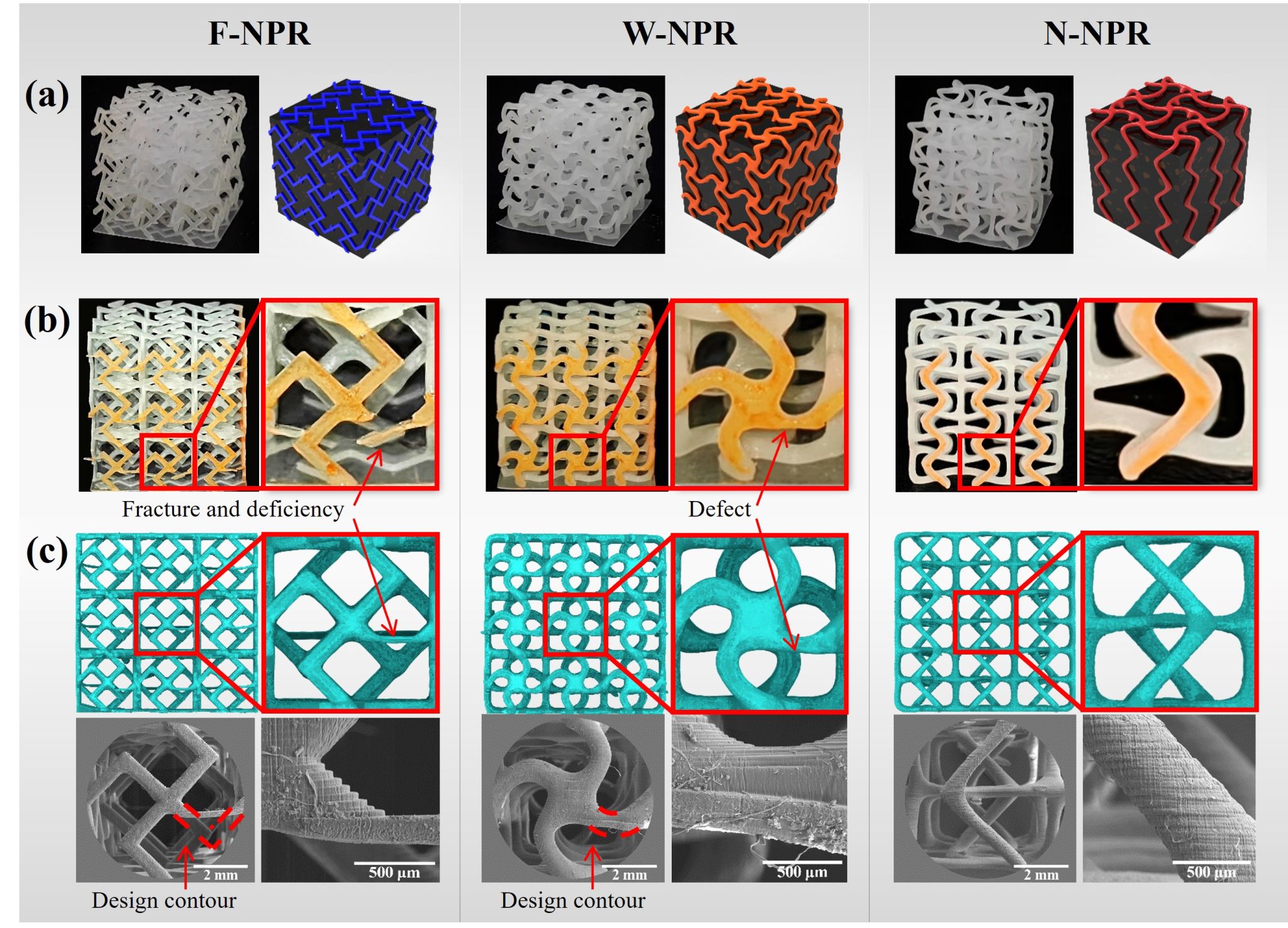 图3 三种结构的物理缺陷对比。通过对比发现,F-NPR结构在悬垂处存在结构断裂和缺失,W-NPR结构在悬垂处仍存在缺失,N-NPR结构无明显缺陷,实现了三者中的最佳可成形性。