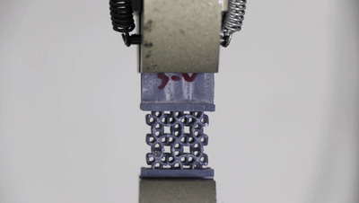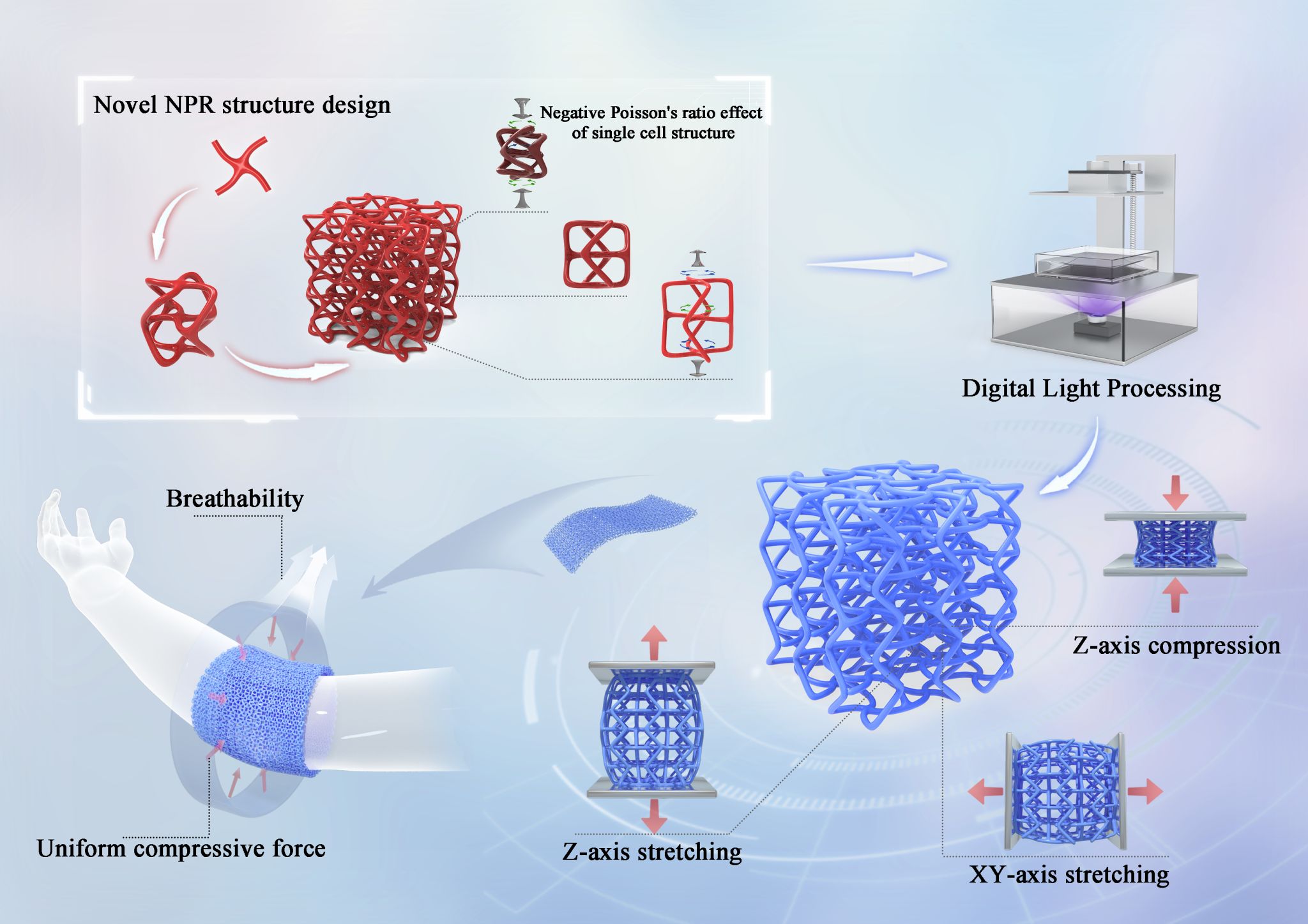 随着智能手表、健康手环等可穿戴设备的普及,人们对穿戴材料的轻量化、高韧性和人体贴合性提出了更高要求。负泊松比材料正是一种“反常识”材料:纵向拉伸时横向膨胀,纵向压缩时横向收缩,展现出独特的力学行为,适用于复杂曲面贴合与能量吸收等场景。然而,传统三维负泊松比结构存在制造难度大、性能调控困难等问题。