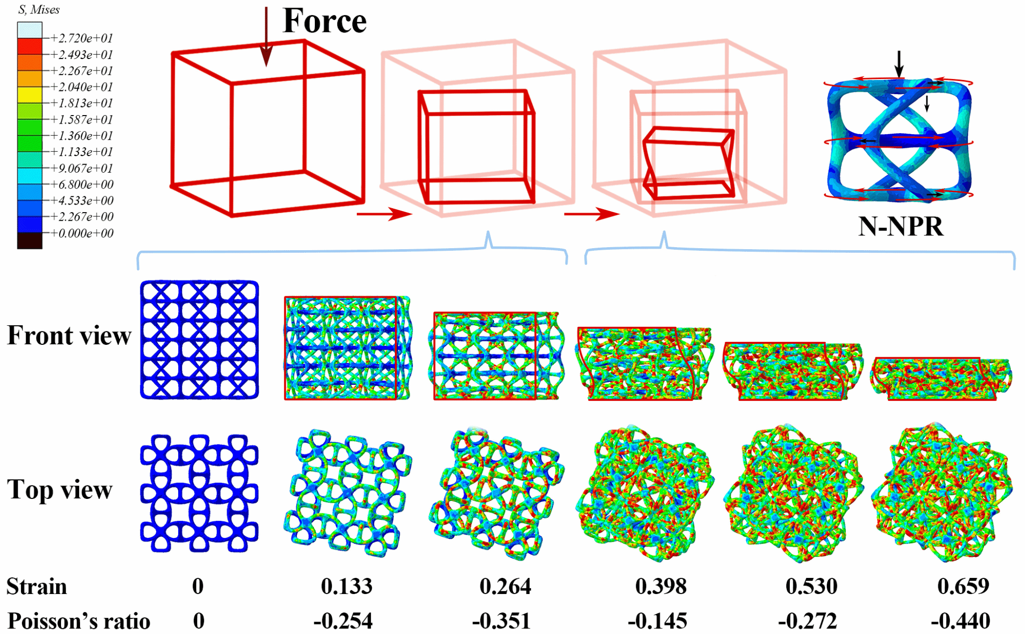 通过有限元模拟与实验验证,研究系统探讨了杆径尺寸与单元尺寸对其结构力学性能的影响。结果表明,通过调节体积分数,可精准调控该结构的压缩/拉伸强度、泊松比及能量吸收能力。该结构在压缩与拉伸过程中均表现出显著的负泊松比效应,并在压缩载荷下呈现出独特的两段式旋转-扭转变形机制,极大拓展了材料设计的自由度(图4)。