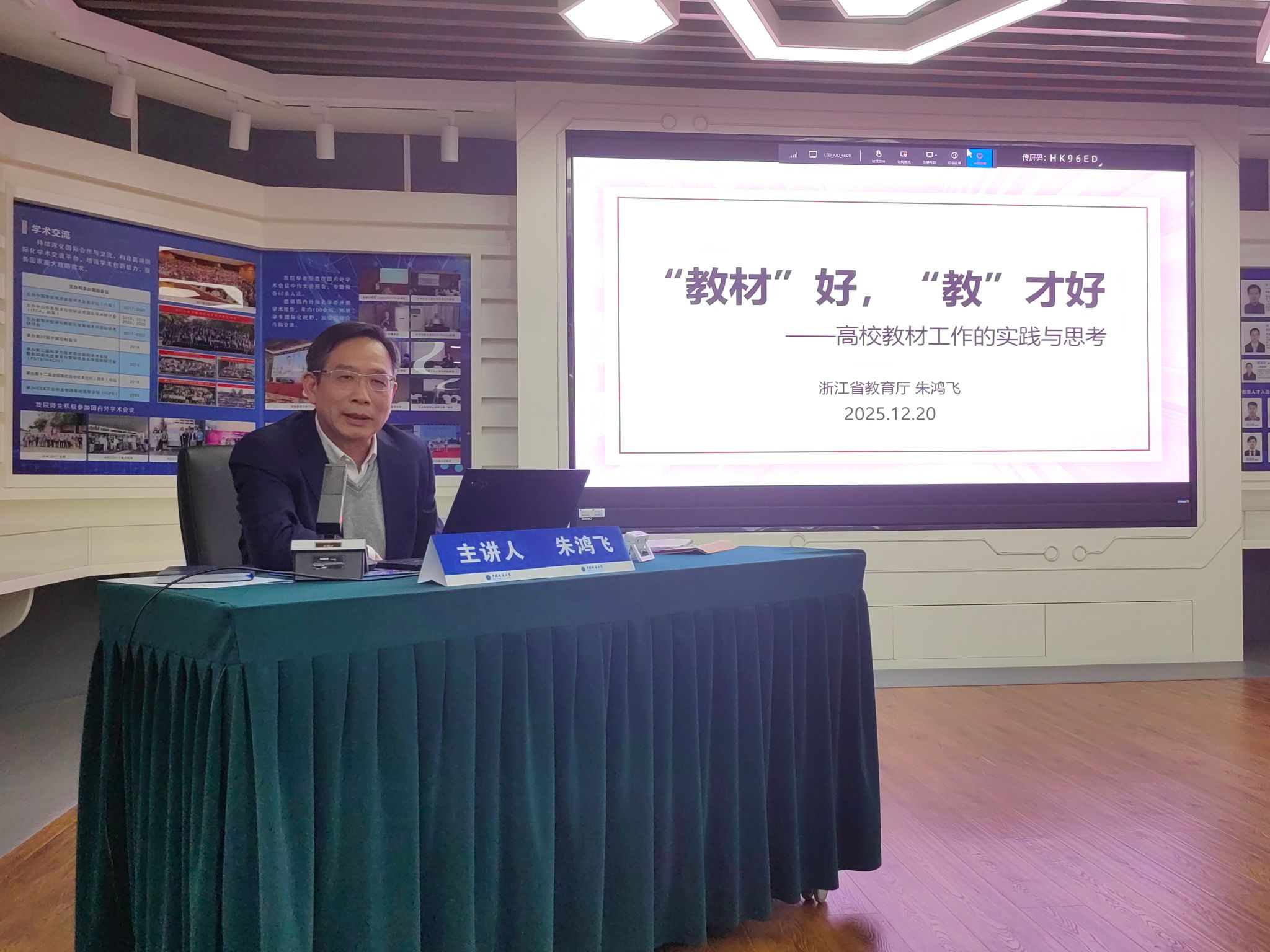 朱鸿飞作《“教材”好,“教”才好——高校教材工作的实践与思考》专题辅导报告,他带领参训学员深入学习领会习近平总书记关于教材工作的重要指示精神,结合浙江省普通高等学校教材管理实践,他认为,教材工作是一项政治工作,做好教材工作须建立“大教材观”,并向大家分享做好教材工作的“稳、精、严、选、管”五字诀,为学院加强教材建设工作提供指导。