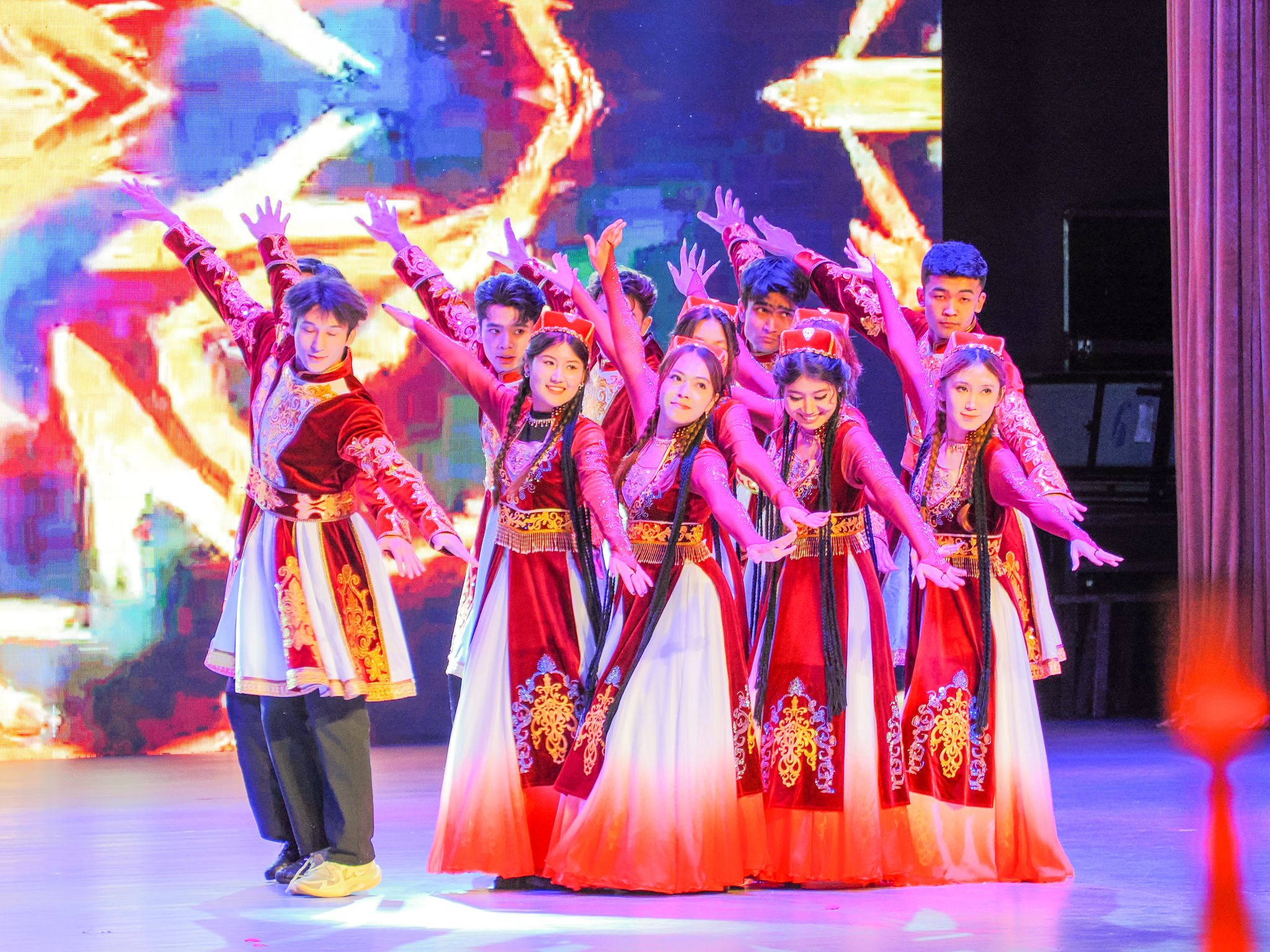 弘毅堂里,编钟国乐团一曲《春华秋实》拉开晚会帷幕。金钉子合唱团深情献唱《世界赠予我的》,舞蹈团带来的《只此青绿》舞出山水诗意,中南民族大学与我校石榴籽民族文化社分别带来《旅人》《丝路双韵》,展现“民族一家亲”的深厚情谊。