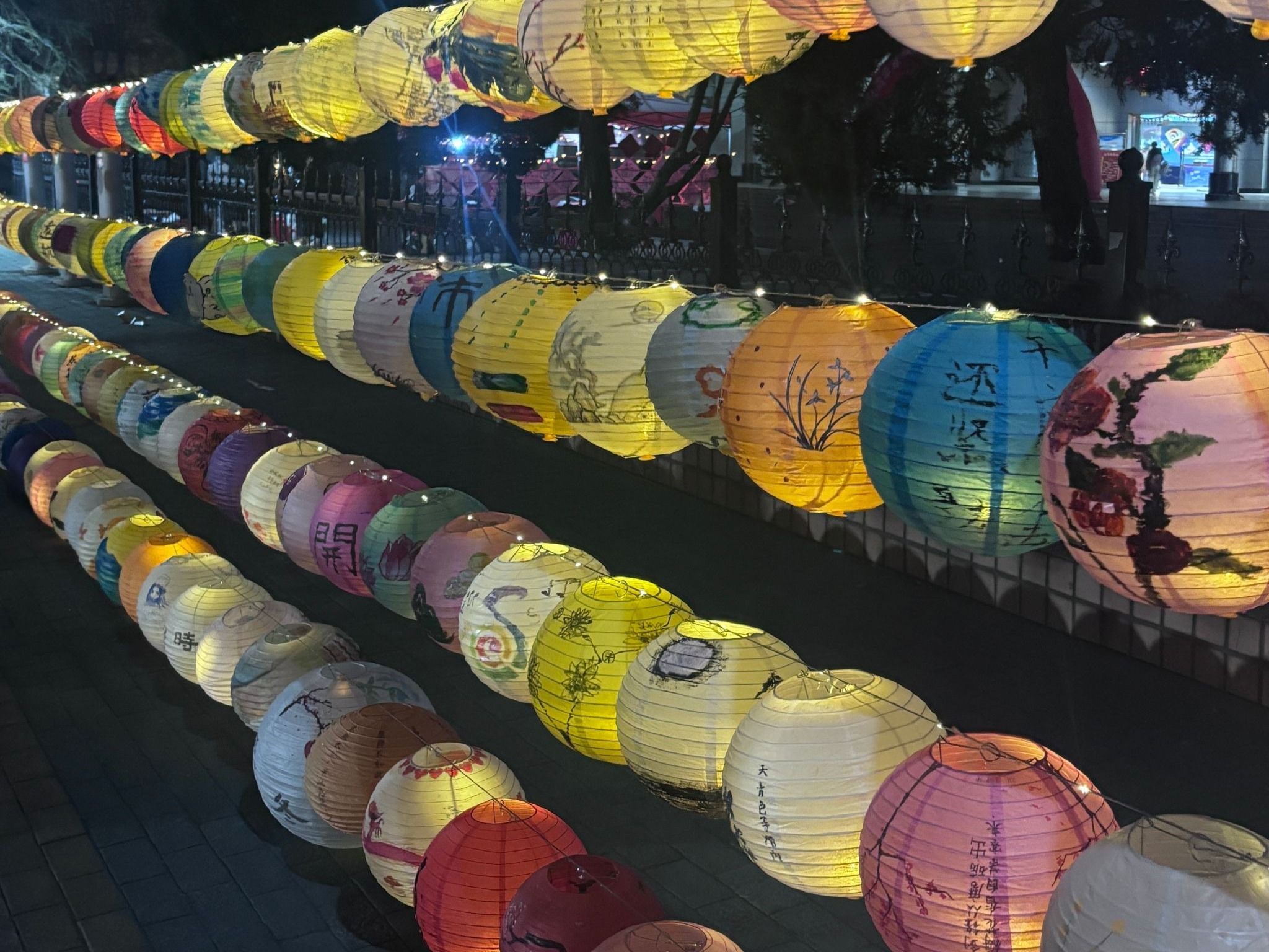 灯笼挂起,彩灯闪烁。各学院同学的原创花灯让校园瞬间年味满满,从可爱萌宠、山水意境到科幻未来,每一盏花灯都是同学们的创意凝结。