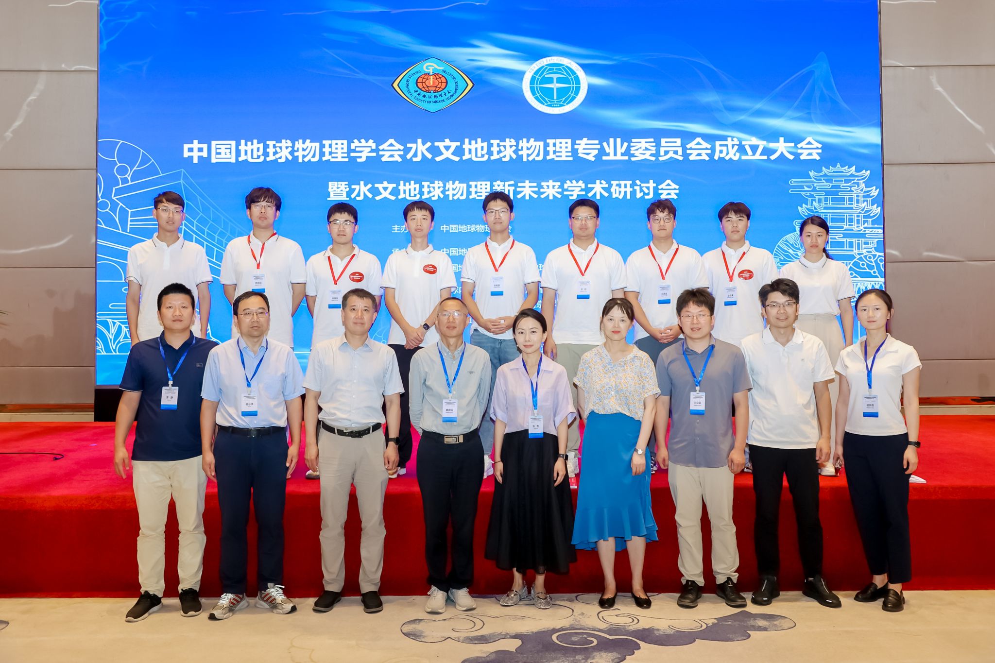 2025年,胡祥云(前排左四)牵头成立中国地球物理学会水文地球物理专业委员会,与团队师生在成立大会合影