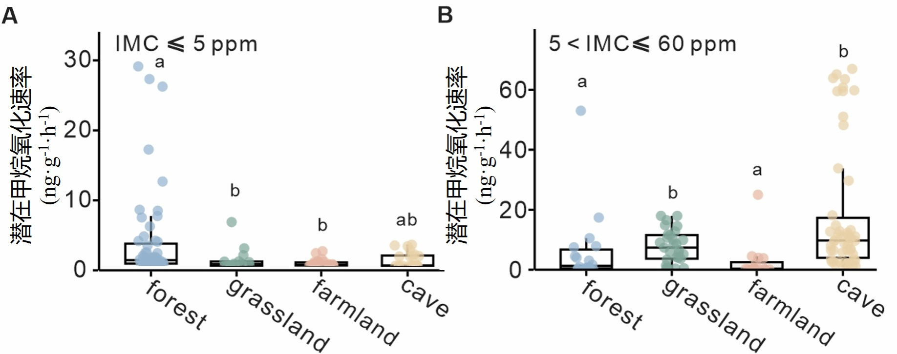 图2 洞穴、森林、草地和农田样品的潜在甲烷氧化速率比较。