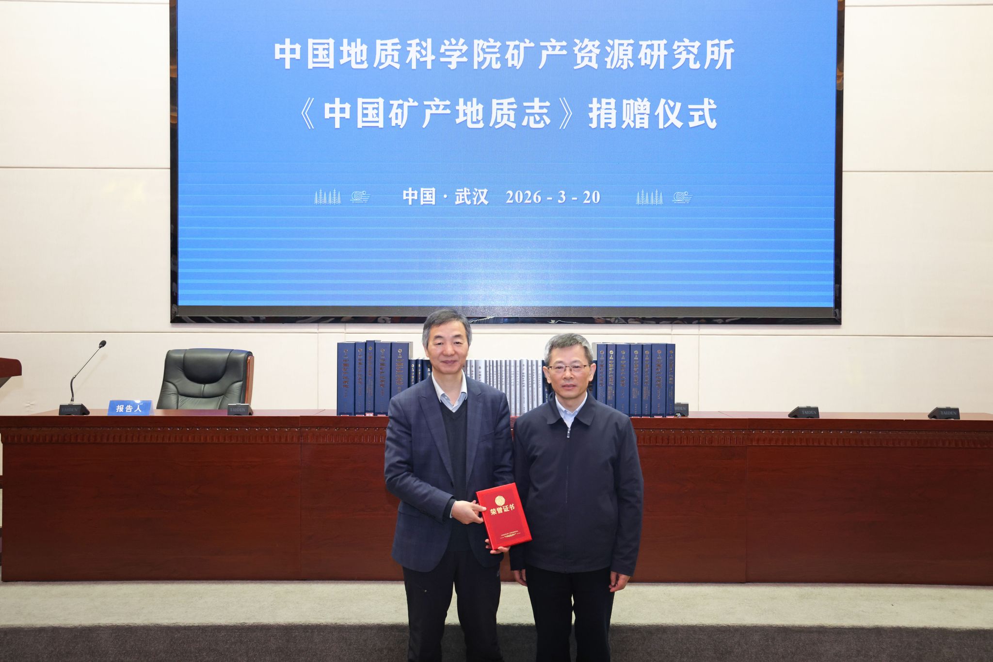 捐赠仪式上,王登红代表中国地质科学院矿产资源研究所向我校捐赠《中国矿产地质志》,图书档案与文博部部长帅斌代表学校接受捐赠,校长李建威向王登红颁发捐赠证书。