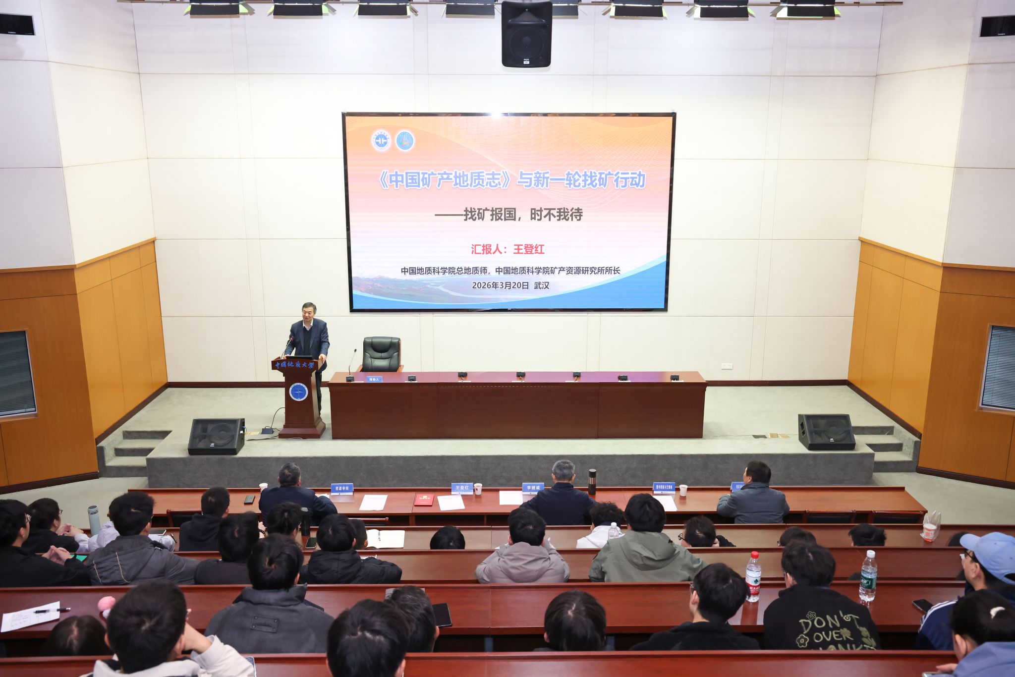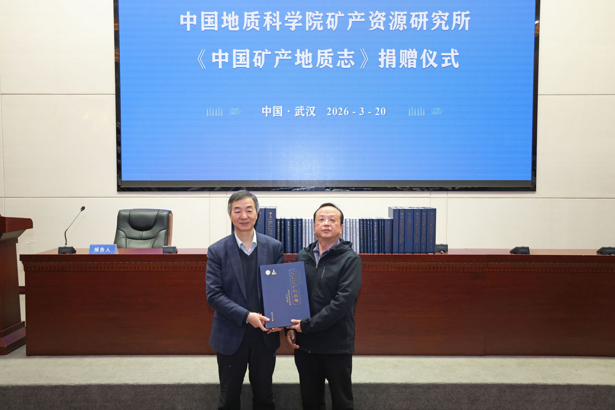 捐赠仪式结束后,王登红作“《中国矿产地质志》与新一轮找矿突破战略行动”专题报告。报告中,王登红以“找矿报国,时不我待”为主线,系统阐释了《中国矿产地质志》作为百年矿产勘查成果集大成之作的研编历程与时代价值。他从首部《中国矿产地质志·江西卷》的出版讲起,回顾了这套志书从点及面、从省到全国、由矿种拓展至区带的发展历程,展现了我国矿产勘查事业从筚路蓝缕到硕果累累的奋进之路。
