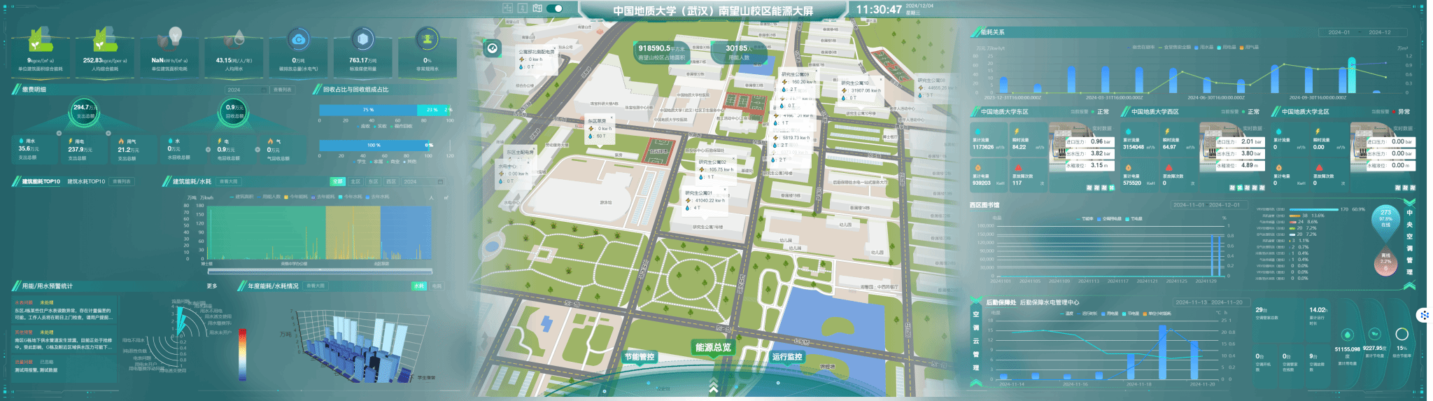 紧跟数字化转型浪潮,后勤保障部以智慧化建设为抓手,制定多项信息化建设纲领性文件,构建起覆盖师生“生活圈”与内部“生产圈”的智慧后勤体系,推动后勤治理体系和治理能力现代化。在食品安全领域,建成“互联网+明厨亮灶”智慧食安平台,在湖北省高校率先实现食品安全智慧监管全覆盖;在宿舍管理领域,完成68栋学生宿舍楼人脸识别门禁建设,两校区数据互通、安全预警功能全面落地;在资源管理领域,打造水电一体化能源管理平台、房产管理系统等数字化工具,整合8套原有能源系统对接学校数据中台,推动资源配置从“静态保障”向“动态优化”转型。“智慧后勤可视化平台”的投入使用,实现房产、住宿、水电等核心业务数据“一屏统览”,以数据驱动后勤治理变革,为学校发展提供精准数据支撑。
