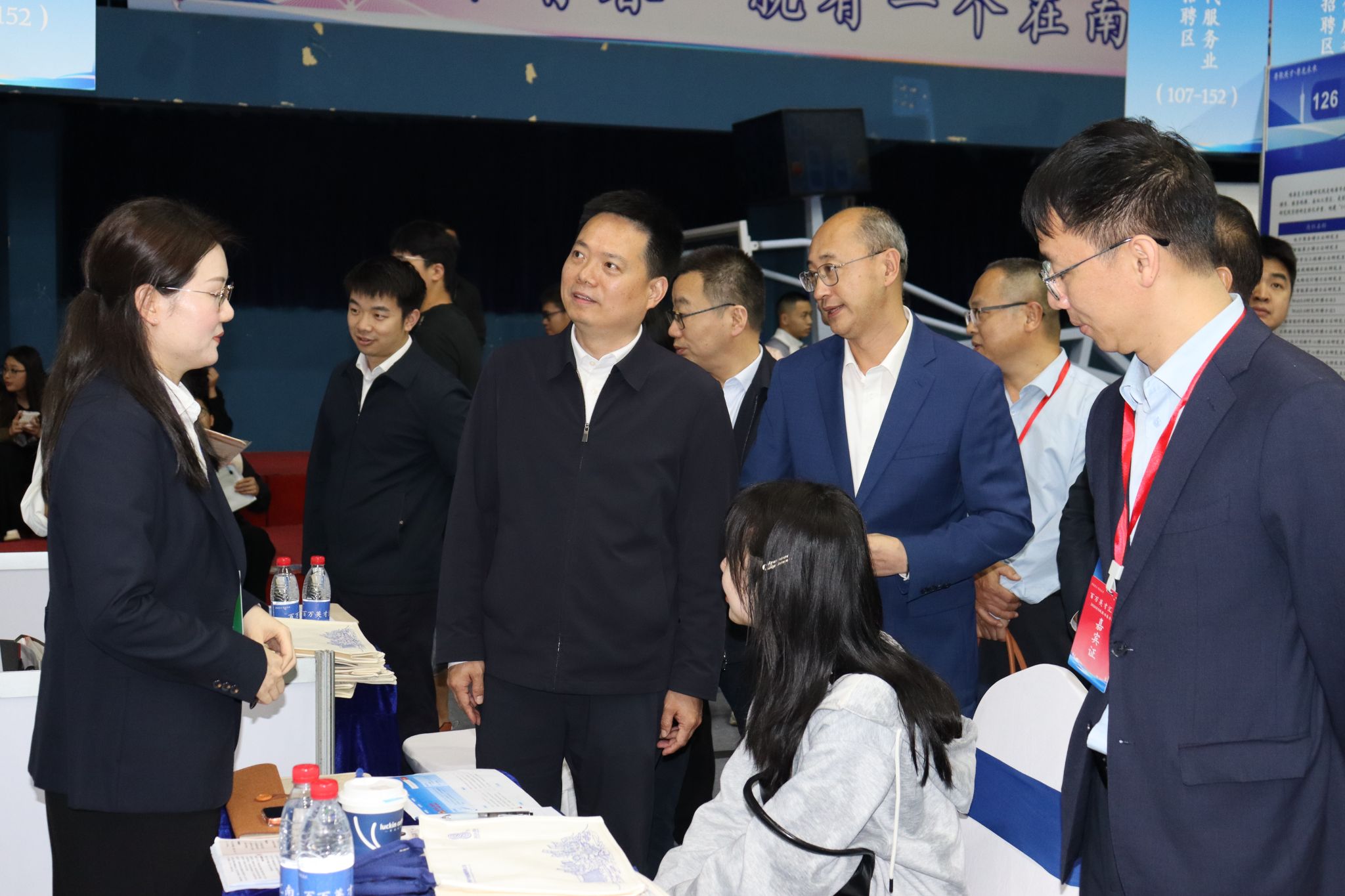 胡守庚、曲维震一行前往体育馆招聘会现场,了解企业招聘需求和学生就业求职情况。