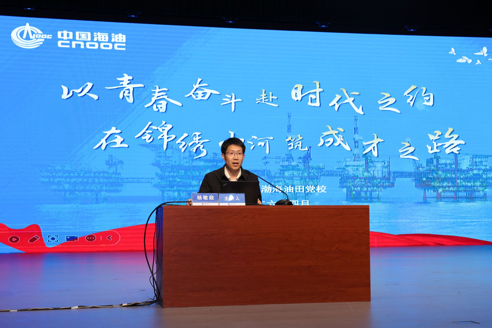 杨敏政以《以青春奋斗赴时代之约 在锦绣山河筑成才之路》为题,回溯了中国海油人“我为祖国献石油”的峥嵘岁月。他从1965年渤海下海勘探讲起,分享了自己从锦州9-3油田操作工起步、参与稠油热采攻关、带领青年突击队战海冰保生产的亲身经历。他勉励学员把一线作为历练熔炉,在“边散小杂”中强组织力,在“急难险重”中强领导力,在“高精碎稠”中强创新力,在“安危冷暖”中强向心力,把青春华章写在祖国大地上。