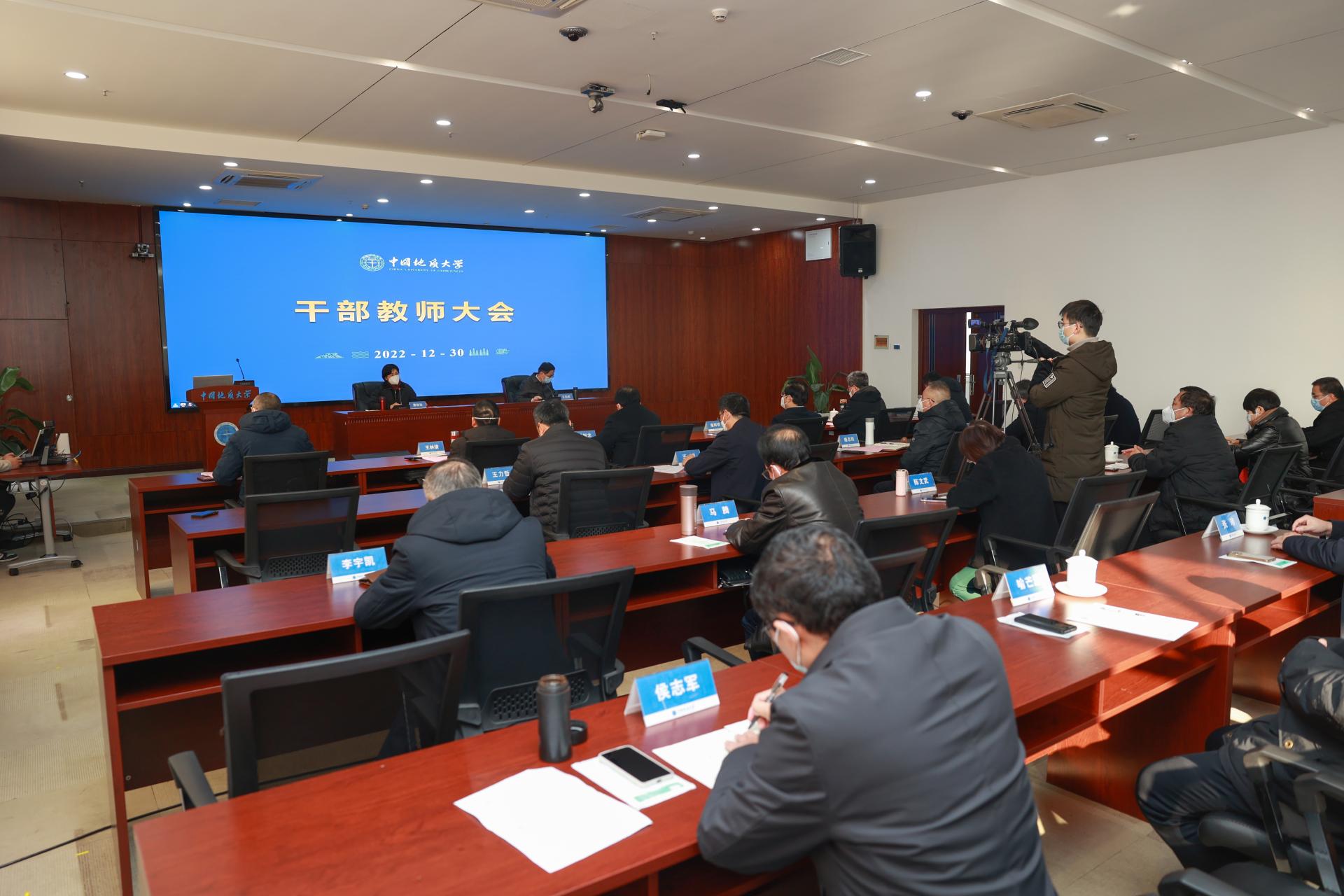 地大新闻网讯(记者 王俊芳)12月30日,我校在南望山校区教学综合楼举行干部教师大会。全体校领导,院士,党委常委、校长助理,党委委员、纪委委员,全体中层干部,教师代表,市级以上党代表、人大代表、政协委员,民主党派负责人,离退休老同志代表等线上、线下参加会议。校党委书记黄晓玫主持会议。