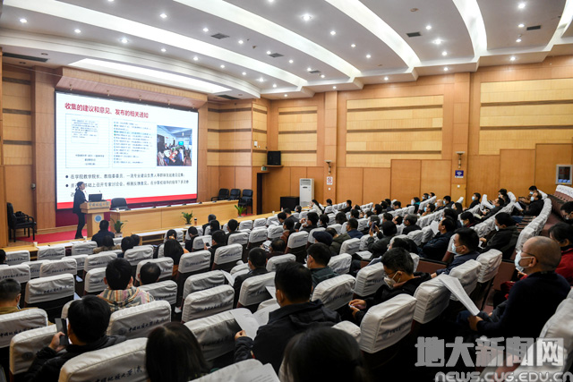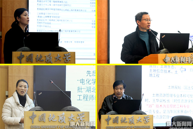 本科生院副院长王莹介绍了学校本科专业建设现状,并对《中国地质大学(武汉)一流本科专业建设管理办法》进行了解读。地球科学学院院长章军锋、国家级一流专业建设点负责人帅琴、国家级一流专业建设点负责人王占岐分别以《打造地质学拔尖人才培养高地---地学院一流专业建设实践与思考》《国家级一流本科专业建设---应用化学》《土地资源管理一流专业建设的思考与实践》为题作了主题报告。