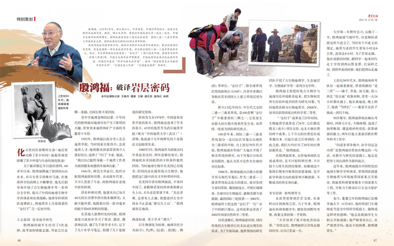 为了破译数亿年以前的密码,60多年以来,殷鸿福踏遍了祖国的山山水水,在石头里寻找蛛丝马迹,在地质科学的高峰上不懈攀登。他先后倡导和开创了古生物地理学等一系列分支学科,提出了中国的地球生物学学科体系和发展战略;他领导科研团队迎难而上,使地质史上分量最重的“金钉子”之一定址中国。