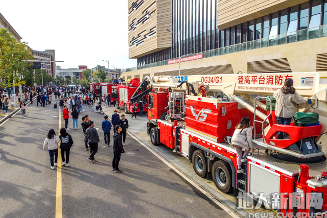 左岭消防救援站官兵在消防救援装备展示区,进行消防救援装备讲解展示,学生们认真倾听并进行体验操作,很多学生还登上消防救援车进行体验。