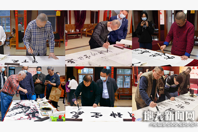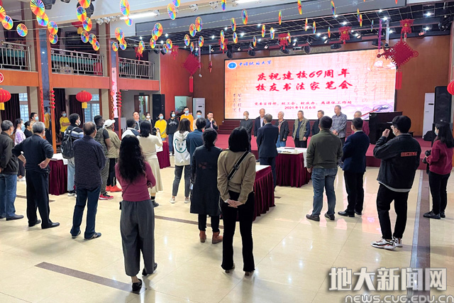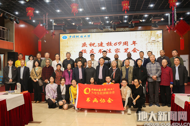 地大新闻网讯(通讯员李梦琳 摄影周斐霏 尚宗义 刘梓琪 龚祝存)11月6日,庆祝建校69周年校友书法家笔会在校工会一楼大厅举行。校党委副书记、工会主席王林清,著名书法家、我校八七级探矿工程系校友寇克让,湖北省高校老年协会会长、湖北省书法家协会高校分会主席丁振国,湖北省高校书法家协会副主席陈建桥、段奇洲、杜沛然、姚洪磊,湖北知名画家刘维之等应邀参加笔会。教职工书法爱好者、学生书法协会会员代表、留学生代表参加了本次活动。活动由工会常务副主席喻芒清主持。