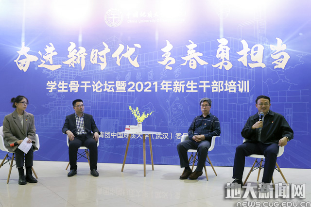 地大新闻网讯(通讯员吴迪 韦仕莉 摄影刘梓琪)11月4日,我校学生骨干论坛暨2021年新生干部培训开班仪式在南望山校区大学生活动中心举行。副校长王华,本科生院副院长邬海峰、就业指导处副处长沈波,各学院团委组织部部长,全体2021级新生班长、团支书参加仪式。校团委书记朱荆萨主持仪式。