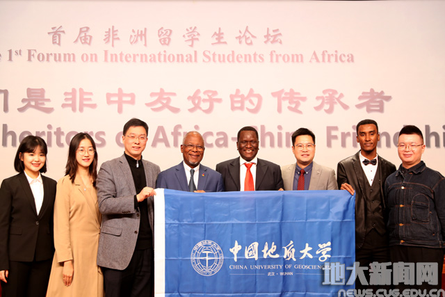 非盟驻华使团长、喀麦隆驻华大使马丁·姆帕纳(左四)与我校师生代表合影