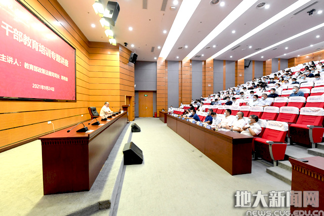 地大新闻网讯(记者许小康 田甜)9月24日,学校在南望山校区东区教学综合楼召开党委理论学习中心组学习(扩大)会议,专题学习习近平总书记在庆祝中国共产党成立100周年大会上的重要讲话精神,教育部政策法规司司长邓传淮应邀作专题辅导报告。全体校领导、党委常委、校长助理,机关全体中层干部,各学院(培养单位)党委书记、副书记、2022届毕业生辅导员参加会议。党委书记黄晓玫主持会议。
