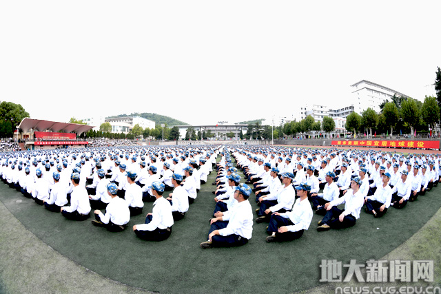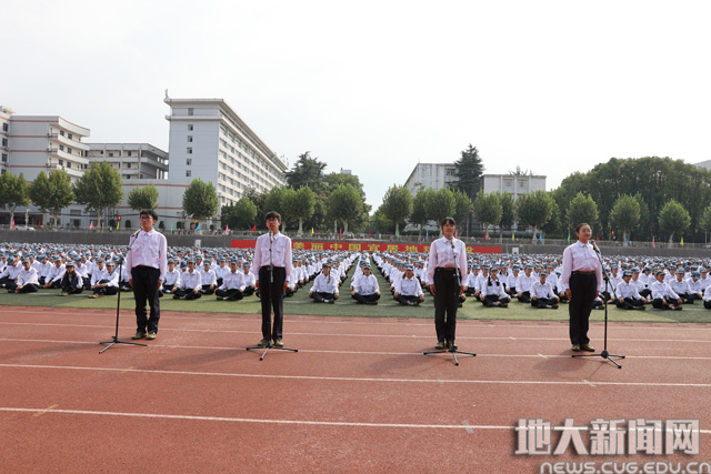 开学典礼后,全场师生共同唱响校歌《勘探队员之歌》,嘹亮悠扬的歌声响彻地大校园。