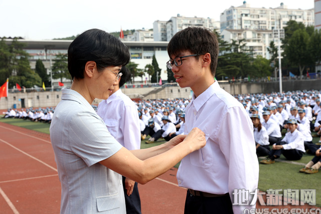 校党委书记黄晓玫为新生代表佩戴校徽。