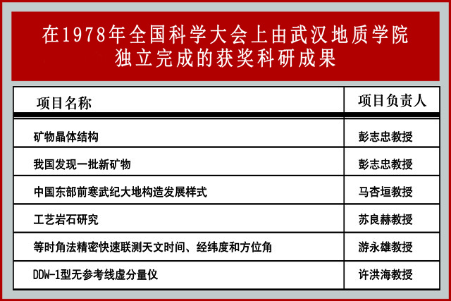 大会举行了隆重的颁奖仪式,表彰了新中国成立以来近30年全国各条战线涌现出来的7657项科研成果,表彰了826个先进集体和1192名先进科技工作者。武汉地质学院受到表彰的重大科技成果28项,其中由我校独立完成的成果6项,与兄弟单位合作完成科研成果22项。彭志忠被评为先进科技工作者,他领导的实验室荣获先进集体奖,他领衔研究的矿物晶体结构、我国发现一批新矿物等2项成果是6项我校独立完成的获奖成果中的两项,占比1/3。武汉地质学院被授予10份奖状,其中有4份是颁给彭志忠的,占比40%。学校获奖数量居于湖北省乃至全国高等院校前列。这是对我校武汉地质学院时期办学水平的充分肯定和鼓励鞭策,也是对彭志忠的莫大肯定和鼓舞。包括我校在内的全国科教工作者的积极性、创造性被有效激发出来,只争朝夕、奋发图强,为早日实现科学技术现代化多作贡献的氛围很快浓厚起来。