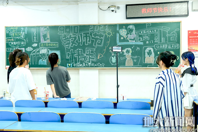 9日晚9点下课后,地大1700名学生在次日有课的170余间教室,连夜创作了170余幅板画。一百多幅板画作品风格迥异,精彩纷呈:有的运用传统中国风致敬至圣先师孔子的为师之道;有的绘制了任课老师的卡通Q版形象;有的用“桃李不言,师恩难忘”等文字表达对老师的深情厚意;有的专门选取了老师教授课程的相关元素作为插画;有的则着重表现老师的求学工作经历及研究成果......同学们用自己的方式为老师们送上最真挚的祝福。