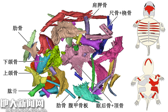 胚胎骨骼的复原与重建;左图为3D重建图,右图红色部分为识别出的龟胚胎骨骼