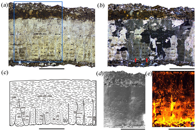 蛋壳径切面(a)单偏光显微镜下图像;(b)正交偏光显微镜下图像;(c)素描图;(d)扫描电子显微镜下图像;(e)阴极发光图像。比例尺代表1毫米