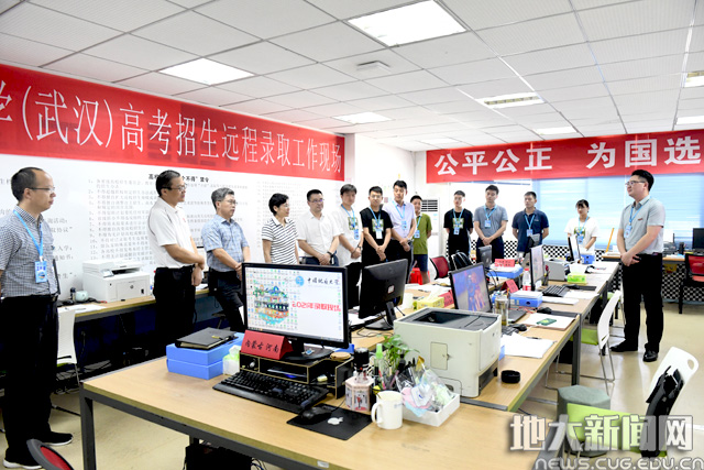 地大新闻网讯(通讯员霍少孟 摄影张玉贤)7月22日下午,校党委书记黄晓玫、副校长王华一行来到招生远程录取工作现场,看望并慰问暑假期间坚守岗位、奋战在高招录取一线的工作人员,现场检查指导我校高招录取工作。学校办公室、本科生院、学生就业指导处相关单位负责人陪同。