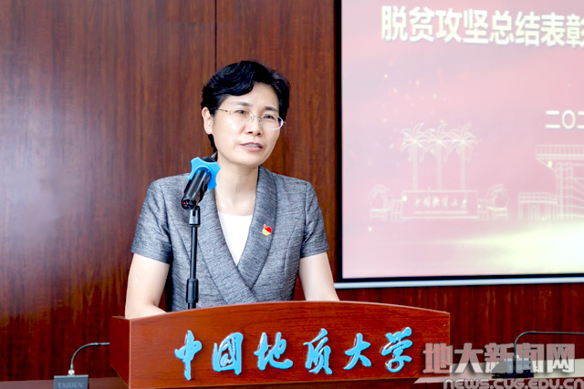 黄晓玫以《弘扬伟大脱贫攻坚精神 奋力书写乡村振兴新篇》为题作总结讲话。她代表学校向受到表彰的先进典型表示热烈祝贺,向奋战扶贫一线的广大师生致以崇高敬意。她说,八年来,学校始终将扶贫工作作为首要政治任务和头等大事,坚持尽锐出战,选派扶贫铁军队伍;坚持党建引领,筑牢攻坚战斗堡垒;狠抓教育扶贫,阻断贫困代际传递;强化科技扶贫,促进产业提档升级;推进消费扶贫,助力群众增收致富;深化志智双扶,激发脱贫内生动力,书写了地大人决战决胜脱贫攻坚的精彩答卷。