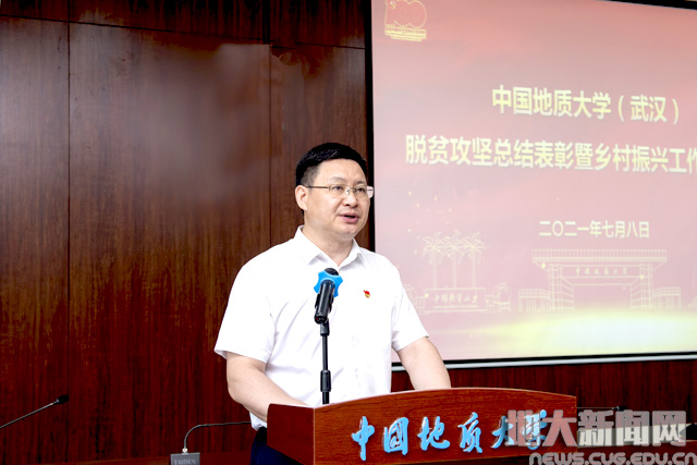 刘杰作题为《巩固拓展脱贫攻坚成果 接续服务乡村振兴战略》的报告。他说,党的十八大以来,学校先后承担了省部定点扶贫十堰市竹山县小河村、云南省保山市施甸县的工作任务,承担了对滇西应用技术大学珠宝学院、塔里木大学的援建工作,以及对口支援恩施州巴东县、宜昌市夷陵区湖北省“616”工程等。八年来,学校提高政治站位,强化使命担当,全面擘画扶贫工作“路线图”;发挥特色优势,聚焦地方所需,精心绘就扶贫工作“施工图”;总结工作经验,夯实帮扶基础,高效完成扶贫工作“竣工图”;弘扬攻坚精神,巩固帮扶成果,深度服务乡村振兴“新蓝图”。他强调,当前正值脱贫攻坚向乡村振兴转段的历史过渡期,大家要意气风发地主动融入国家战略和地方发展,在深度服务乡村振兴战略中展现新担当、实现新作为,奋力谱写地大人服务国家乡村战略的辉煌篇章。