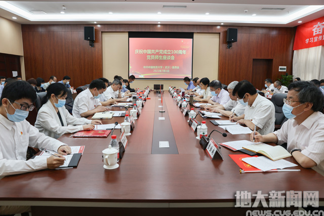 地大新闻网讯(记者庞伟红 田甜 摄影王俊芳)7月1日,我校在南望山校区教学综合楼A701举行庆祝中国共产党成立100周年党员师生座谈会,学习宣传贯彻习近平总书记在庆祝中国共产党成立100周年大会上的重要讲话精神。在校校领导,党委常委,校长助理,优秀党员、优秀党务工作者、先进基层党组织、优秀教师、青年人才、离退休党员、校友优秀党员、民主党派和无党派人士代表,党委理论中心组成员及相关单位主要负责人参加座谈。