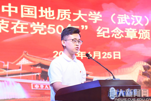 青年党员代表、地球科学学院2017级本科生张曼有发言。毕业后的他将成为一名选调生,奔赴一线、建设基层。他代表全体学子向老党员们承诺,一定做好新时代的接棒人,将几代地质人在奋勇拼搏中淬炼成的“艰苦朴素、求真务实”的校训精神、“勇攀高峰、敢于担当”的南迁精神,“上天、入地、下海、登极”的勇者气概带到新的工作环境中,用奋斗擦亮爱党爱国的青春底色。