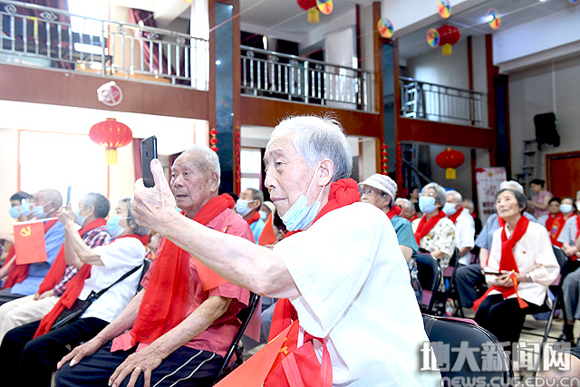 仪式开始前,全场一同观看视频《光荣在党50年 奋斗终身传薪火》。视频中的照片墙记录了每一位在党50年的老党员初心不改、砥砺奋进的光荣瞬间,在座的老党员们感动不已,纷纷拿出手机拍照留念。