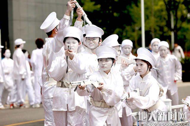 伴随着气势恢宏的《红旗颂》,身穿白色服装,头戴白色毛巾,手持模型刀枪的数百位同学们,在铿锵有力的旁白声中依次摆出了“虎门销烟”“太平天国”“武昌起义”“五四运动”“五卅运动” “南昌起义”“抗日游击战争”和“胜利渡长江”共八幅人民英雄纪念碑的雕塑造型,引得下课路过的师生纷纷驻足观赏,并拿出手机与“雕塑”合影留念。