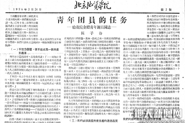 1956年,陈子谷在北京地质学院校刊发表《青年团员的任务——给我院全体青年团员同志》