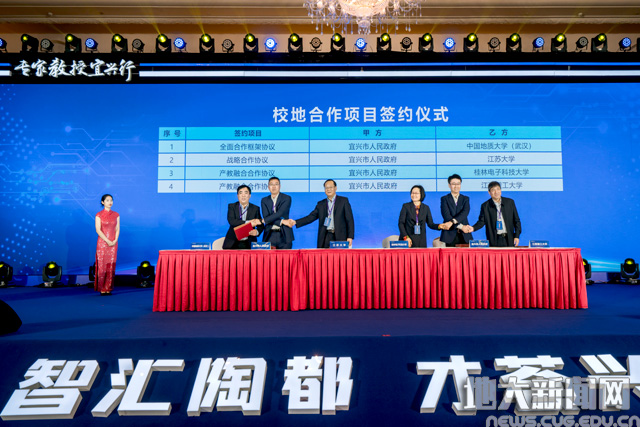 会上,赖旭龙代表学校与宜兴市签署全面合作框架协议,科学技术发展院常务副院长胡圣虹作学校科技推介,副院长吴春明与宜兴奕安陶瓷有限公司董事长鲍鲲鹏为园林陶瓷产业技术创新中心揭牌,自动化学院副院长陈鑫与宜兴摩根热陶瓷有限公司签署意向合作协议,地理与信息工程学院吕建军教授获聘宜兴市“双招双引”引才大使。