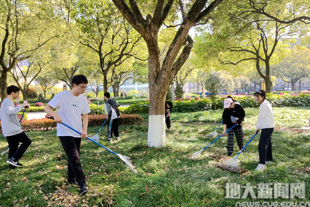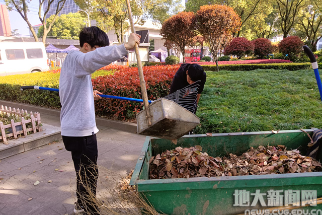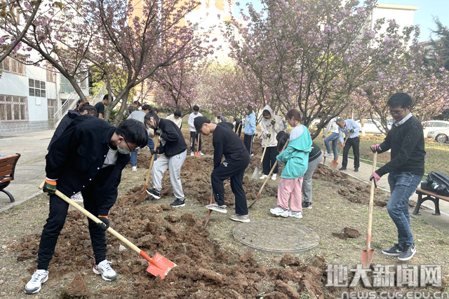 地大新闻网讯(通讯员王茁)3月25日下午,学校南望山校区东区樱花林、西区图书馆绿化广场里,选修《劳动素养与劳动教育》课程的62名同学分为2组,翻整土地、清除杂草、清理杂物,呈现出一派热火朝天的劳动景象。
