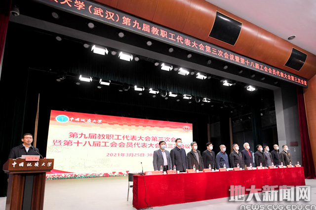 地大新闻网讯(记者庞伟红 摄影王紫璇 张玉贤)3月25日下午,我校第九届教职工代表大会第三次会议暨第十八届工会会员代表大会第三次会议(以下简称“两代会”)在弘毅堂举行。400余名正式代表和特邀代表、列席代表参加会议。