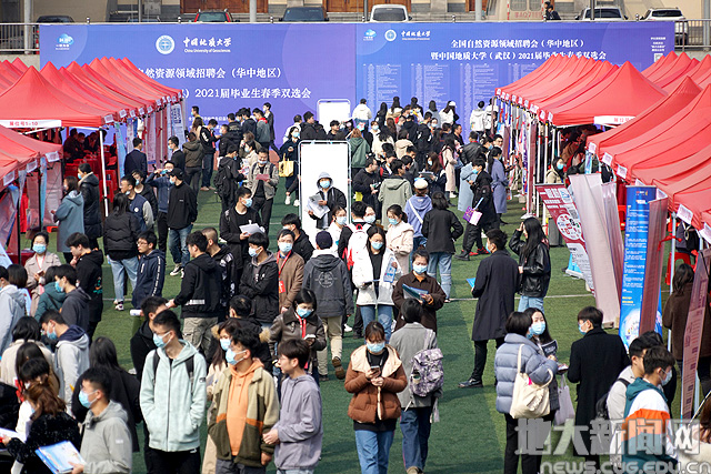 地大新闻网讯 (通讯员刘志兴 彭鑫 郭玉凤 学生记者张钰茹 王丽欣 摄影闫思颖 李艳梅)3月20日,由教育部主办、我校承办的全国自然资源领域招聘会(华中地区)暨中国地质大学(武汉)2021届毕业生春季双选会,在南望山校区西区运动场举行。