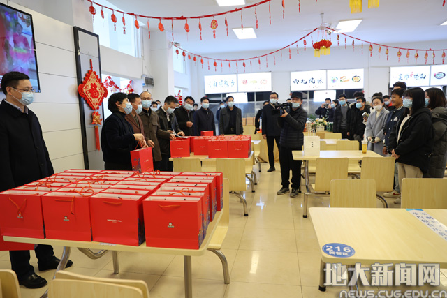 当晚,校领导黄晓玫、王林清、刘杰、刘勇胜,校长助理周爱国及相关部门负责人先后来到东苑食堂、西三食堂,慰问春节留校的学生,向他们送上新春祝福和新年大礼包。
