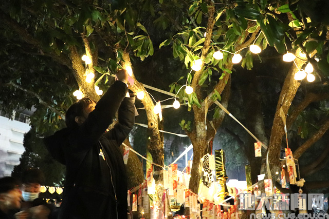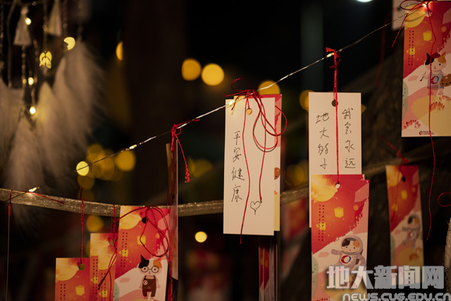 在灯会主路上,同学们还精心设计了两处许愿角,将蒲公英花束灯环绕在布满灯光的许愿树周围。师生们将自己的美好心愿写在许愿签上,挂满枝头,期盼来年得以实现。整个灯会现场其乐融融,喜乐祥和。来自学校子衿汉服社的同学们身着汉服,在主路中心翩翩起舞,或是三两好友相约一起,边看花灯边拍照,用光影留住美好时刻。
