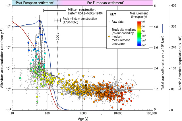 据戴维介绍,为满足对粮食、能源、水资源的需求,人类活动不断改变着陆地自然景观,特别是土地分布格局,这些活动导致沉积物大量迁移,土壤流失加剧。当欧洲定居者在北美大陆进行耕作时,土壤流失加剧,导致大量河流和洪泛平原冲积物的沉积。文章量化了北美大陆冲积物的增长过程,揭示了欧洲定居者到达北美后不久,北美大陆冲积物沉积速率出现的数量级的跃升。