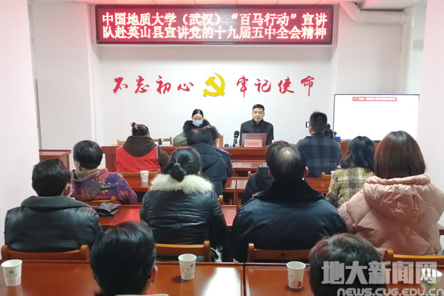 地大新闻网讯(记者霍少孟)12月11日,中国地质大学(武汉)“百名马克思主义学者宣讲队”走进英山县,通过集中宣讲、围桌座谈、入户交流等方式,为广大基层党员干部群众宣讲党的十九届五中全会精神。