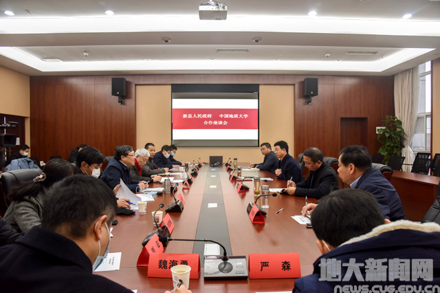 地大新闻网讯(通讯员袁江 张祎 摄影田甜)12月8日,我校与信阳市新县人民政府合作座谈会在南望山校区举行。新县县长夏明夫、副县长张彬,我校副校长傅安洲,党委常委、组织部长储祖旺,双方相关部门负责人参加会议。