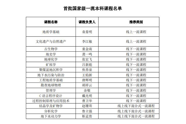 地大新闻网讯(通讯员王美娟)近日,教育部发布了首批国家级一流本科课程认定结果,我校16门课程获批。其中《地质学基础》等2门课程入选国家线上一流课程,《结晶学及矿物学》等3门课程入选国家线上线下混合一流课程,《工程地质学基础》等11门课程入选国家线下一流课程。