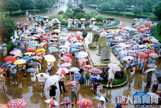 1998年,荆楚夏令营的师生冒雨参观三峡坝基岩芯