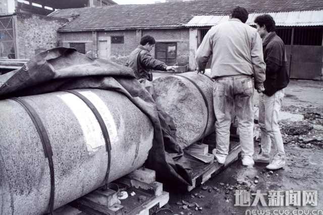 随后,经过多方的沟通,此事有了实质性进展。经得学校同意后,1993年2月22日,鲁连仲、李富强、张凡一行3人再次前往宜昌,落实岩芯标本的吊装事宜。就这样,博物馆工作人员前后7次前往宜昌,最终使得5块坝基岩芯标本和1块葛洲坝岩芯标本落址我校,为美丽的校园增添了新的地质景观。