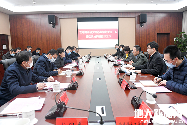 地大新闻网讯(记者田甜 摄影张玉贤)11月23日,湖北省文明办主任黄学龙,湖北省委宣传部文明创建三处处长万春梅,湖北省教育厅思政教育与社科研究处处长赵耿、副处长雷松来到我校,就全国文明校园创建工作展开调研。校党委书记黄晓玫,相关职能部门负责人参加座谈。黄晓玫主持会议。