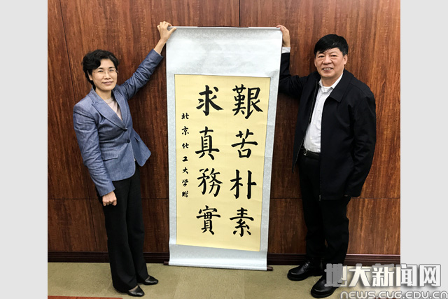 会后,袁自煌向学校赠送了写有地大校训“艰苦朴素 求真务实”的书法作品以及该校的文创作品。